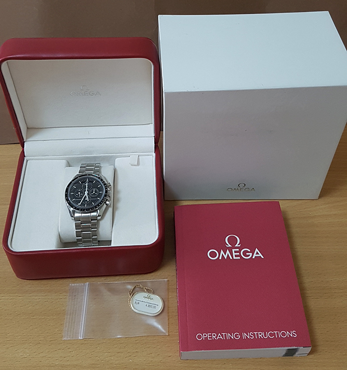 42mm case size. Black dial. Stainless steel case and bracelet. Features a 60-second sub-dial at 9 o′clock, 30-minute recorder at 3 o′clock and 12-hour recorder at 6 o′clock. Large central chronograph seconds hand. Fourth sub-dial at 12 o′clock exhibits moonphase and date function. Tachymetric scale on bezel. Sapphire Crystal glass and display back. Manual-wind chronograph movement, calibre Omega 1866.