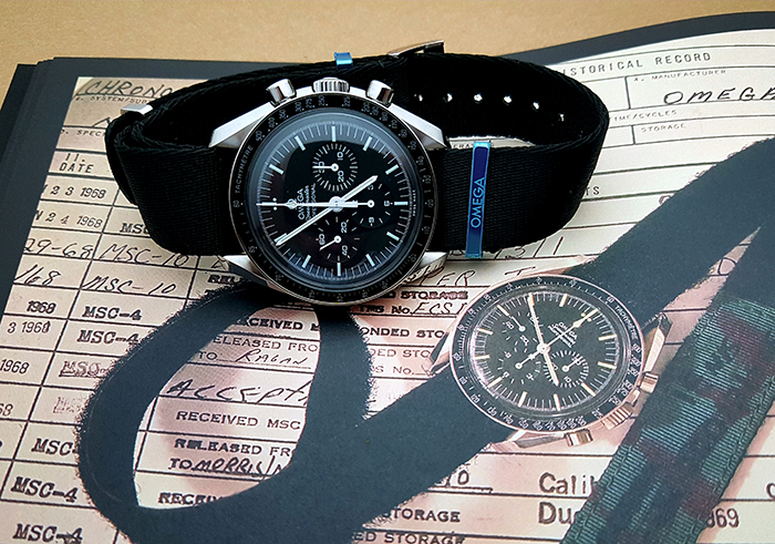 42mm case size. Stainless steel case and bracelet. Black dial with luminous hands and markers and three sub-dials. Case back inscription: “Flight qualified by NASA for all manned space missions. The First watch worn on the moon”. Plexi glass. Manual wind movement, calibre 1861, with chronograph function.